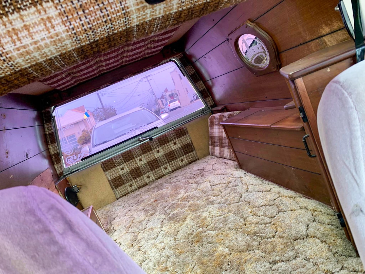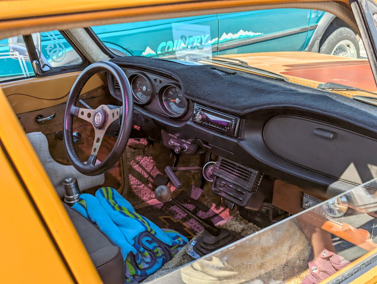 It had a pretty ratty pair of old Camaro seats when we got it. As we were working on it, a Vanner couple from around the corner came by and said they had an old set of tan bucket seats from a 70s Chevy van and if they fit, they’d be glad to sell them to us. They fit! Kinda.