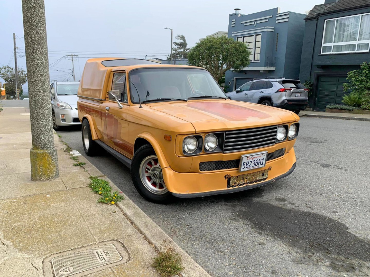 This is “Patience”, a 1975 Chevrolet LUV custom show truck built sometime in the late 1970s that lights up SF’s dreary gray streets like a disco ball of the wrong color. Between the shag carpeting, the wood paneling, the graphics, and the body kit, it’s not hard to see the inspirations of both the bygone era and the 1980s that loomed ahead.
